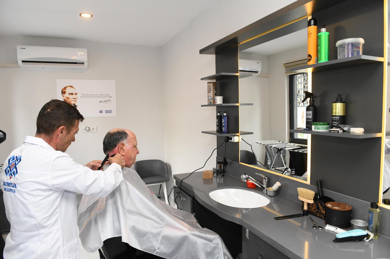 Altıeylül 75. Yıl Parkı içerisinde hizmete açılan berber salonu, özellikle emekli vatandaşların saç kesimi ve temel bakım hizmetlerine daha ekonomik şekilde ulaşabilmesi amacıyla hazırlandı.