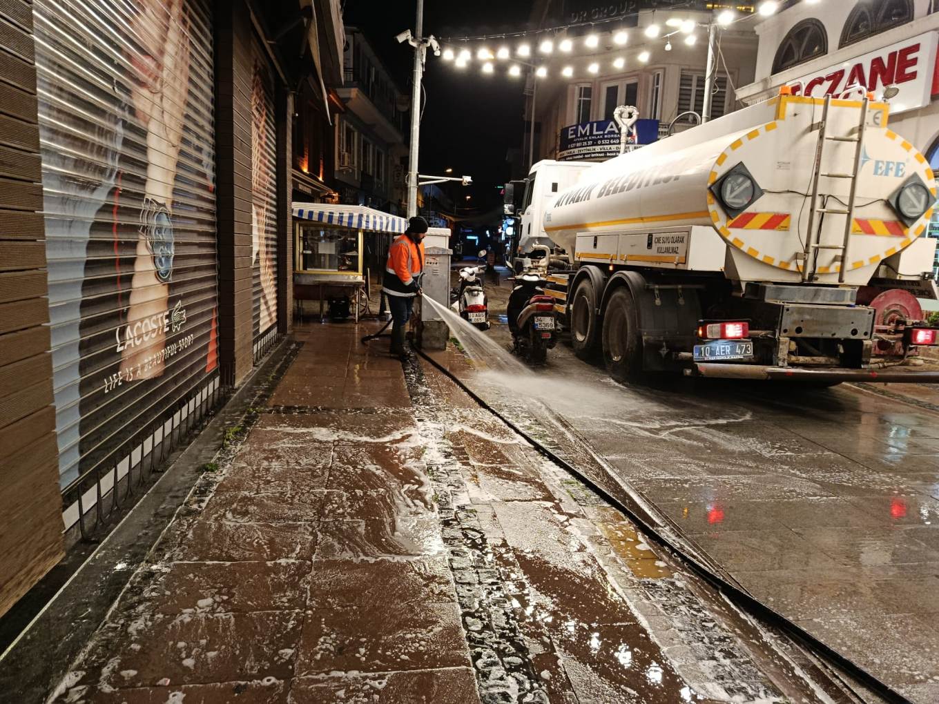 Öte yandan Ayvalık’ın en işlek noktalarından biri olan Talatpaşa Caddesi, gerçekleştirilen temizlik çalışmalarının ardından köpüklü suyla yıkanarak bayram öncesinde pırıl pırıl bir görünüme kavuşturuldu.