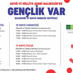 Büyükşehir Belediye Başkanı Ahmet Akın, ‘Balıkesir’de Gençlik Var’ sloganıyla 19 Mayıs Atatürk’ü Anma, Gençlik ve Spor Bayramı onuruna ‘Gençlik Festivali’ düzenliyor. 16-19 Mayıs günleri arasında devam edecek olan festivalin içeriği oldukça zengin. Dört gün boyunca sürecek olan festival, birbirinden eğlenceli organizasyonlara ev sahipliği yapacak. Gençlik Festivali etkinlikleri kapsamında; Avlu’da konserler, Milli Kuvvetler Caddesi’nde de konser, atölye ve etkinlikler yer alacak.