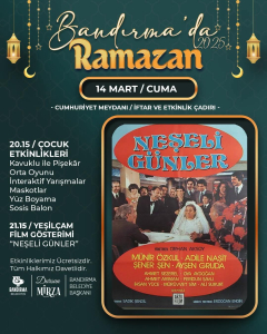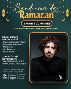 Bandırma Belediyesi, her yıl olduğu gibi bu yıl da Ramazan ayını dolu dolu etkinliklerle karşıladı! Söyleşilerden konserlere, sinema gösterimlerinden çocuklar için özel etkinliklere kadar pek çok programın yer aldığı Ramazan Etkinlikleri, vatandaşlara keyifli anlar yaşatıyor. Tüm etkinlikler ücretsiz olup, Ramazan ayının birlik, beraberlik ve manevi atmosferine uygun şekilde düzenlenmiştir.
