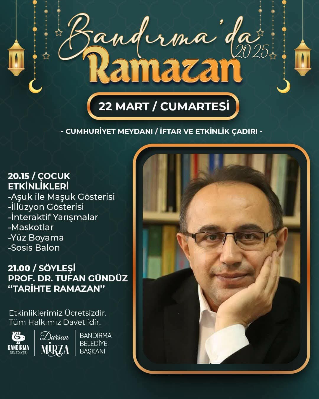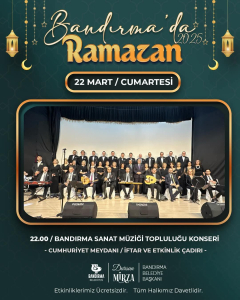 22 Mart Cumartesi günü saat 20.15’te Aşuk ile Maşuk ve illüzyon gösterisiyle eğlenceli anlar yaşanacak. Saat 21.00’de akademisyen ve araştırmacı Prof. Dr. Tufan Gündüz, “Tarihte Ramazan” konulu söyleşisiyle dinleyicilerle buluşacak. Aynı gün saat 22.00’de Bandırma Sanat Müziği Topluluğu, muhteşem bir Türk Sanat Müziği konseri verecek.