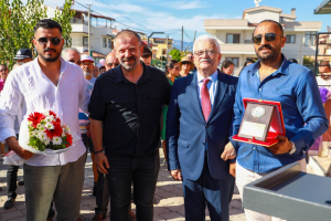 Burhaniye Belediye Başkanı Ali Kemal Deveciler, Nur Çakıroğlu Albak’a çiçek takdim etti. Gömeç Belediye Başkanı Melih Bağcı ise Ümit Aslan ve Uğur Aslan’a plaket takdim etti.
