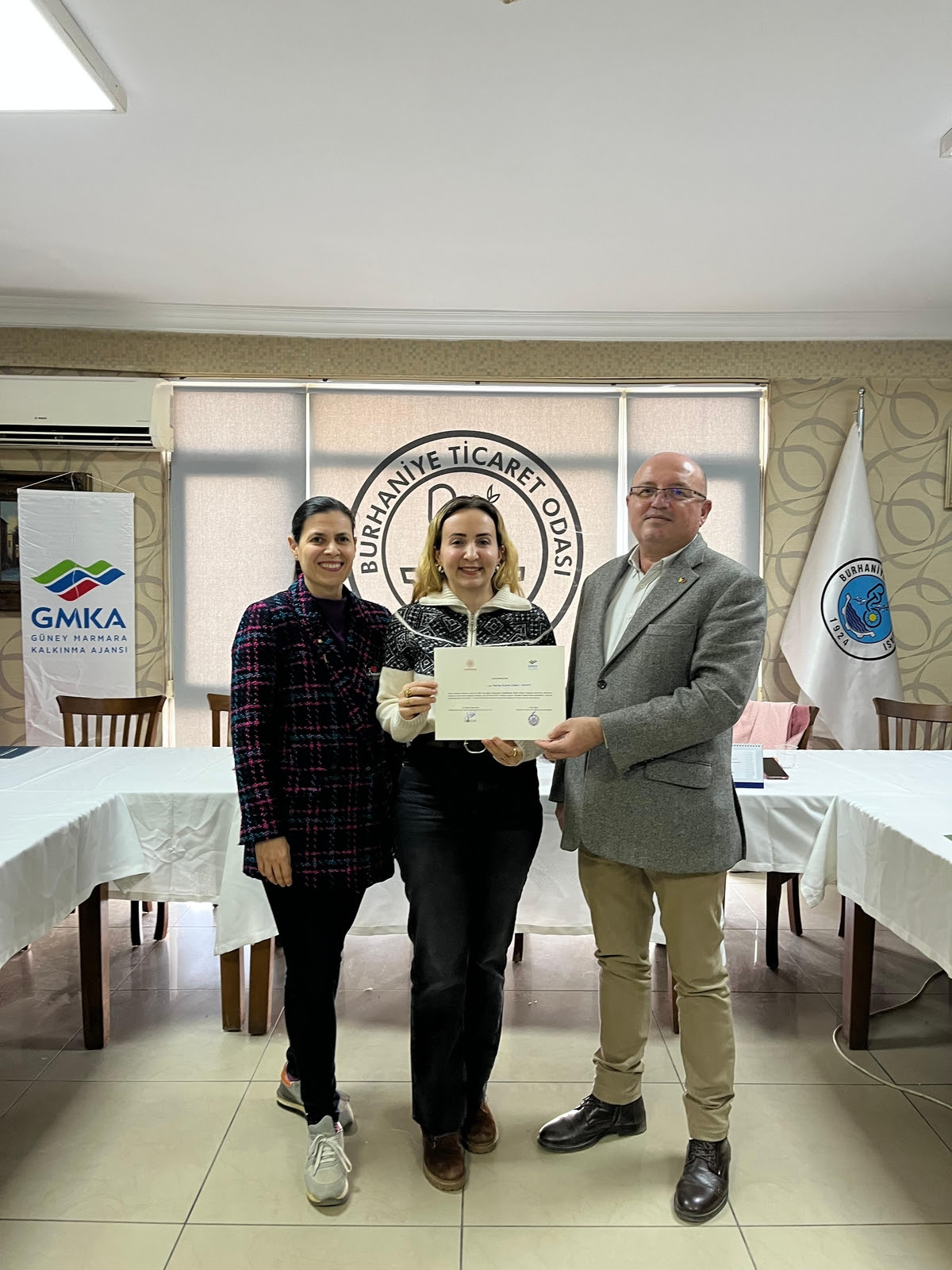 Burhaniye Ticaret Odası ve Güney Marmara Kalkınma Ajansı (GMKA) iş birliğiyle yürütülen “Zeytinin Ustaları Kadın Operatörler” Projesi, 24 Ocak 2025 Cuma günü düzenlenen törenle başarıyla tamamlandı. Proje kapsamında eğitimlerini tamamlayan katılımcılara sertifikaları, Burhaniye Ticaret Odası Yönetim Kurulu Başkanı Hasan Varol ve Meclis Başkanı Erhan İnam tarafından takdim edildi.