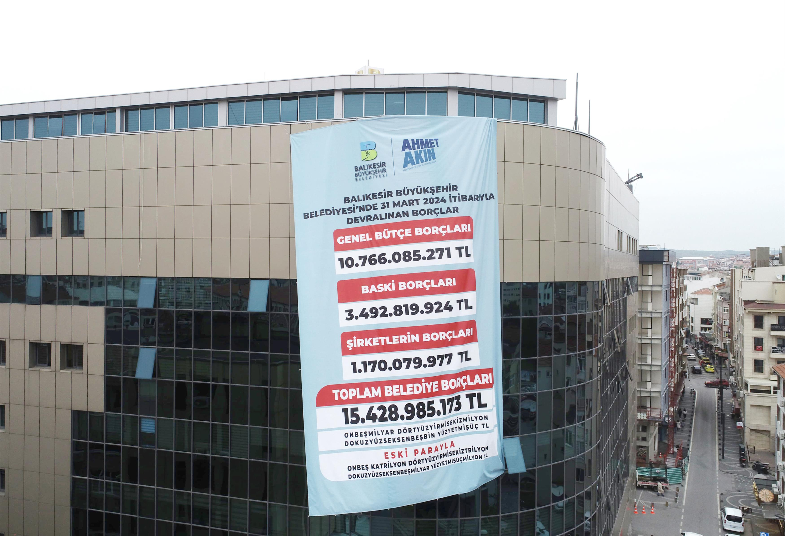 Balıkesir Büyükşehir Belediyesi’nin önceki dönem mali hesapları pankart ile belediye binasına asılarak kamuoyu bilgilendirildi. Devralınan toplam yaklaşık borç 15 milyar 428 milyon 985 bin 173 lira. B...