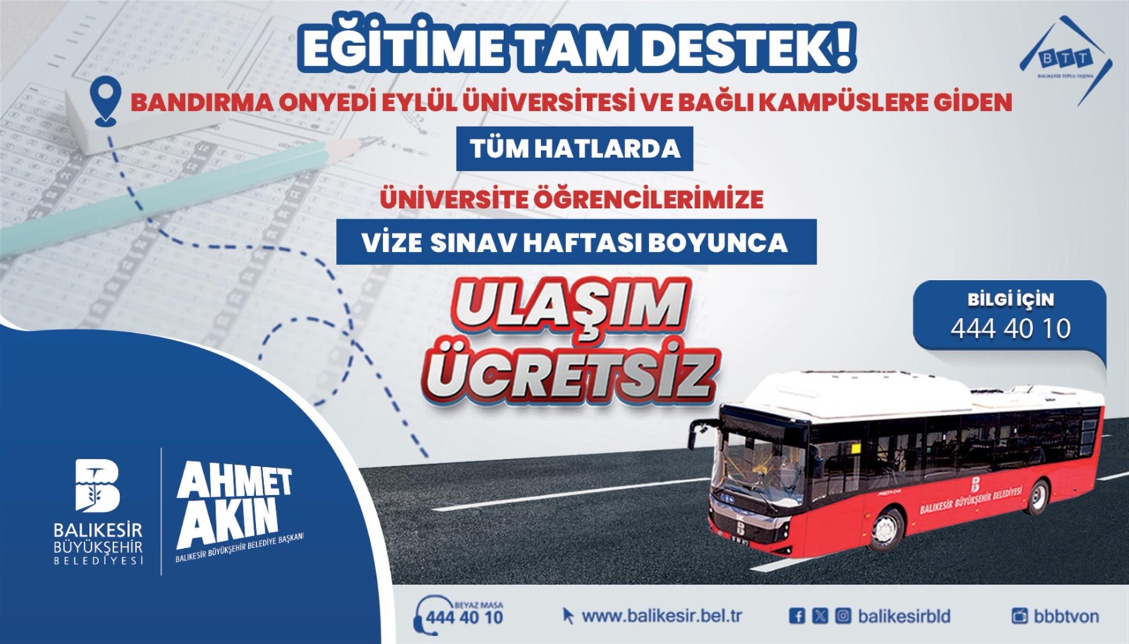 Balıkesir Büyükşehir Belediyesi, 20-28 Nisan günleri arasında Bahar Yarıyılı vize sınavlarını gerçekleştirecek olan Bandırma Onyedi Eylül Üniversitesi öğrencileri için kampüse ve ek binalara ulaşım sa...