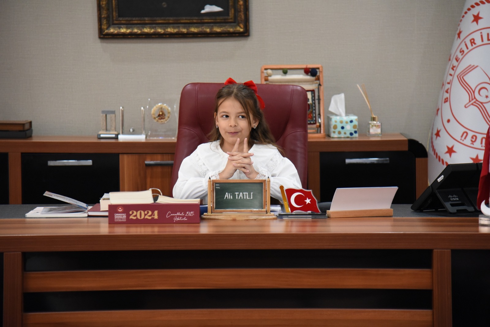 İl Milli Eğitim Müdürümüz Ali Tatlı, 23 Nisan Ulusal Egemenlik ve Çocuk Bayramı dolayısıyla koltuğunu temsili olarak Altıeylül Atköy İlkokulu öğrencisi Serra Türkan’a devretti.