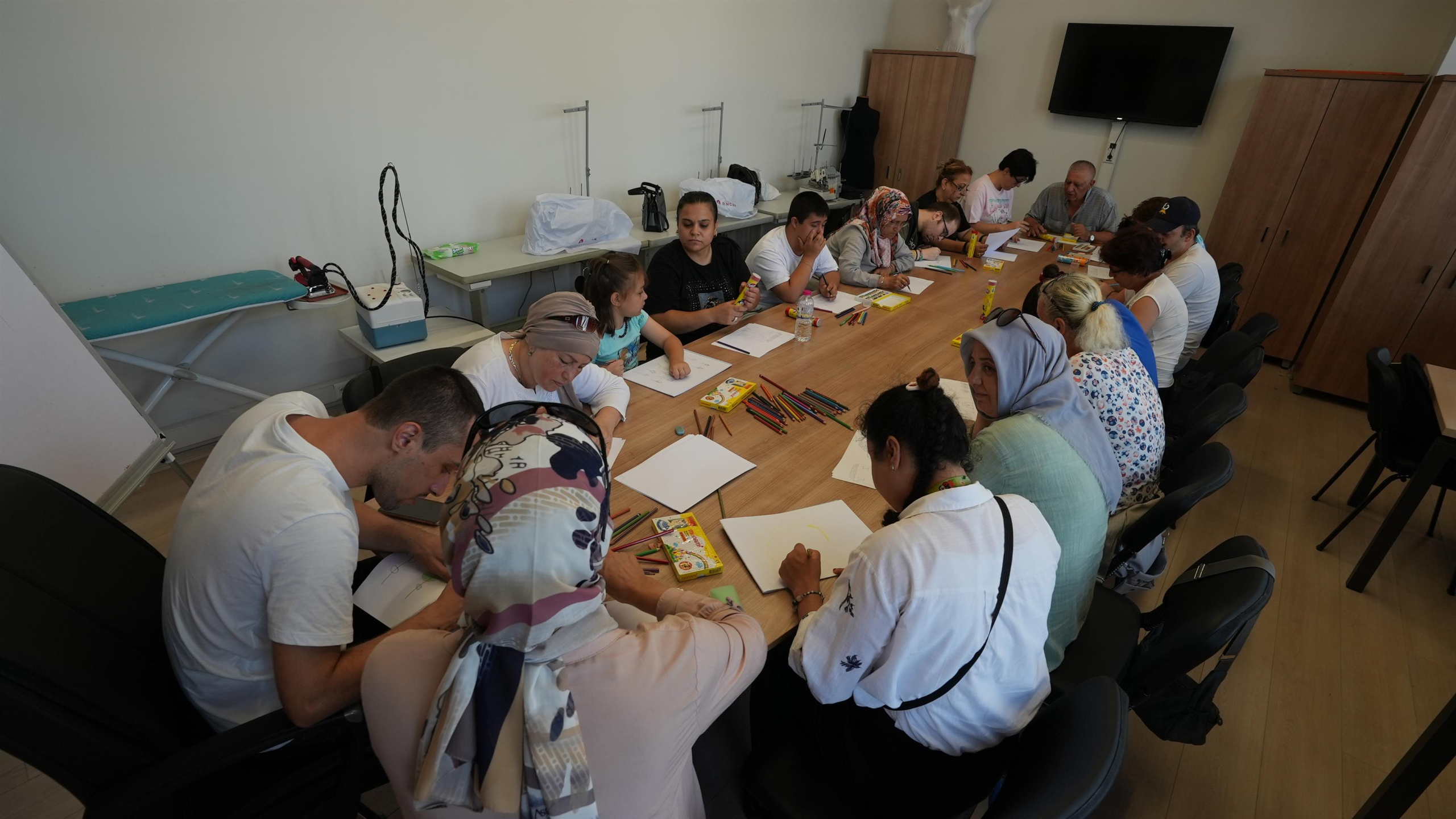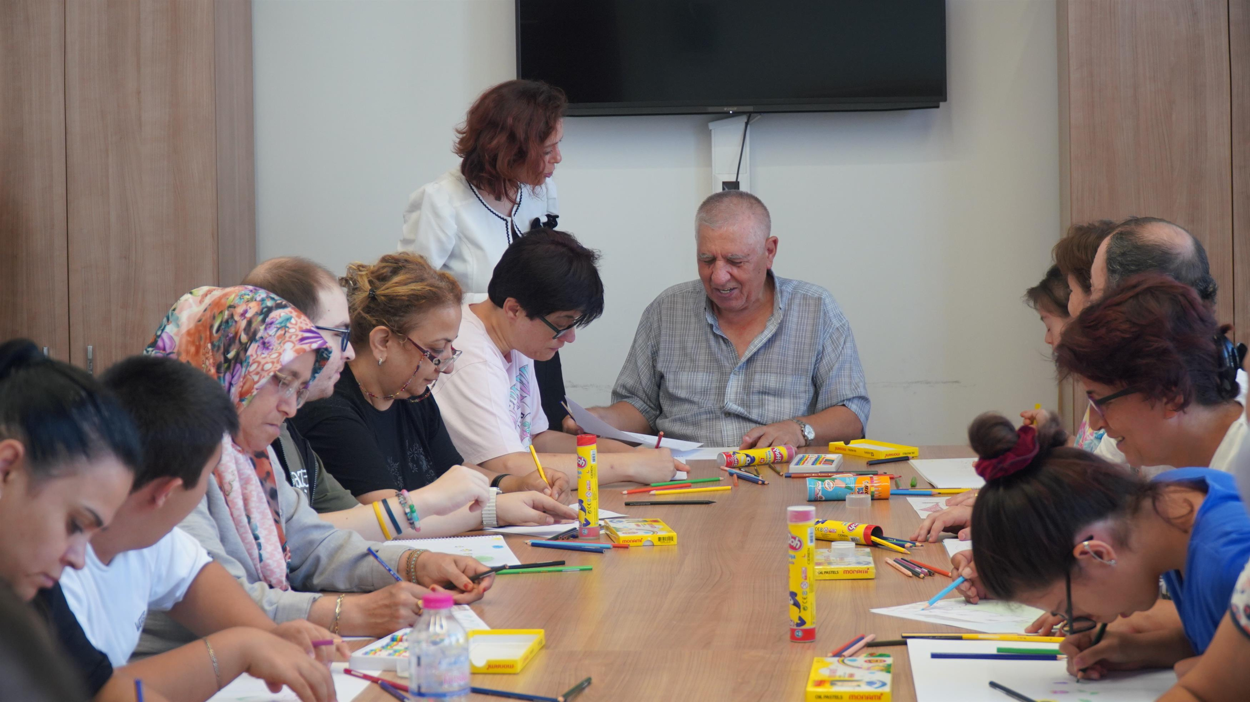 uzman eğitmenler eşliğinde resim kursu yoluyla sanat terapisine katılıyorlar.