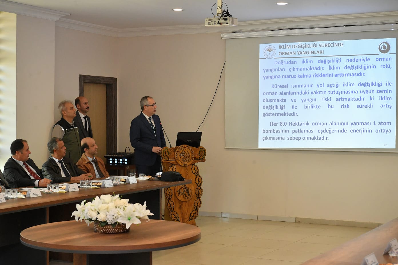 Orman Bölge Müdürü Kemal Kayıran toplantıda; orman yangın istatistikleri, 2023 yılı orman ve kırsal alan yangınları, personel ile kara ve hava araçlarının durumu, 2024 yılı özellikle yaz ayları için yangın önleme çalışmaları, koordinasyon gerektiren konu başlıklarını içeren kapsamlı bir sunum yaptı. 2023 yılında toplamda 98,66 hektar alanda 71 orman yangını ve 432 kırsal alanda yangın yaşandığını aktaran Bölge Müdürü Kayıran, yangınlara müdahale süresinin 13.57 dakika olduğu bilgisini verdi. Orman yangınlarının çıkış sebepleri değerlendirildiğinde en büyük oranın ihmal ve dikkatsizliğe bağlı olduğuna dikkat çekildi. Ayrıca bilinçlendirme ve eğitim çalışmaları kapsamında; 2023 yılında 903 kırsal mahallede 12 bin 855, 2024 yılında ise 802 kırsal mahallede 10 bin 186 vatandaş, avcı, arıcı ve çoban gibi kişilere verilen eğitimlerle etkili mücadelenin güçlendirildiği belirtildi.